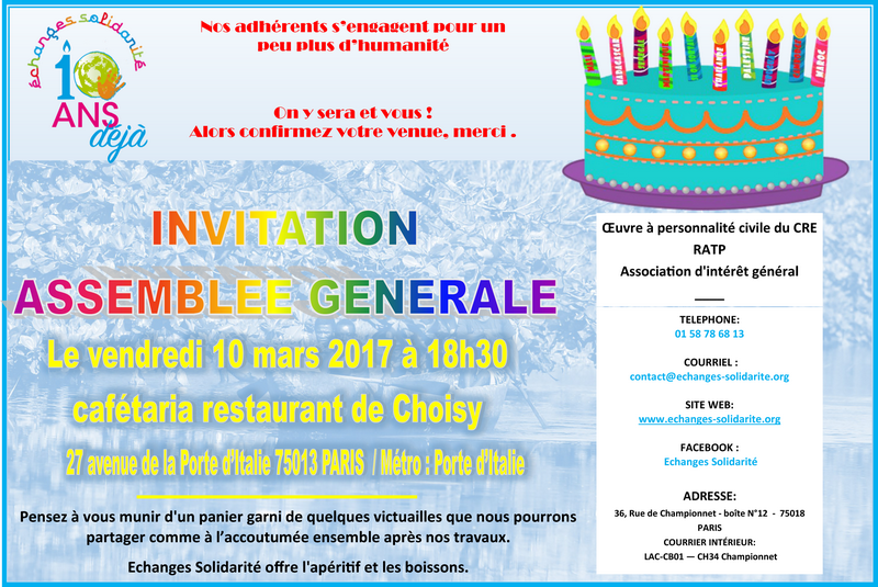 Adhérentes, adhérents d'Echanges Solidarité vous êtes invité-e-s à l'assemblée générale 2017, le vendredi 10 mars à 18h30 à la cafeteria de Choisy